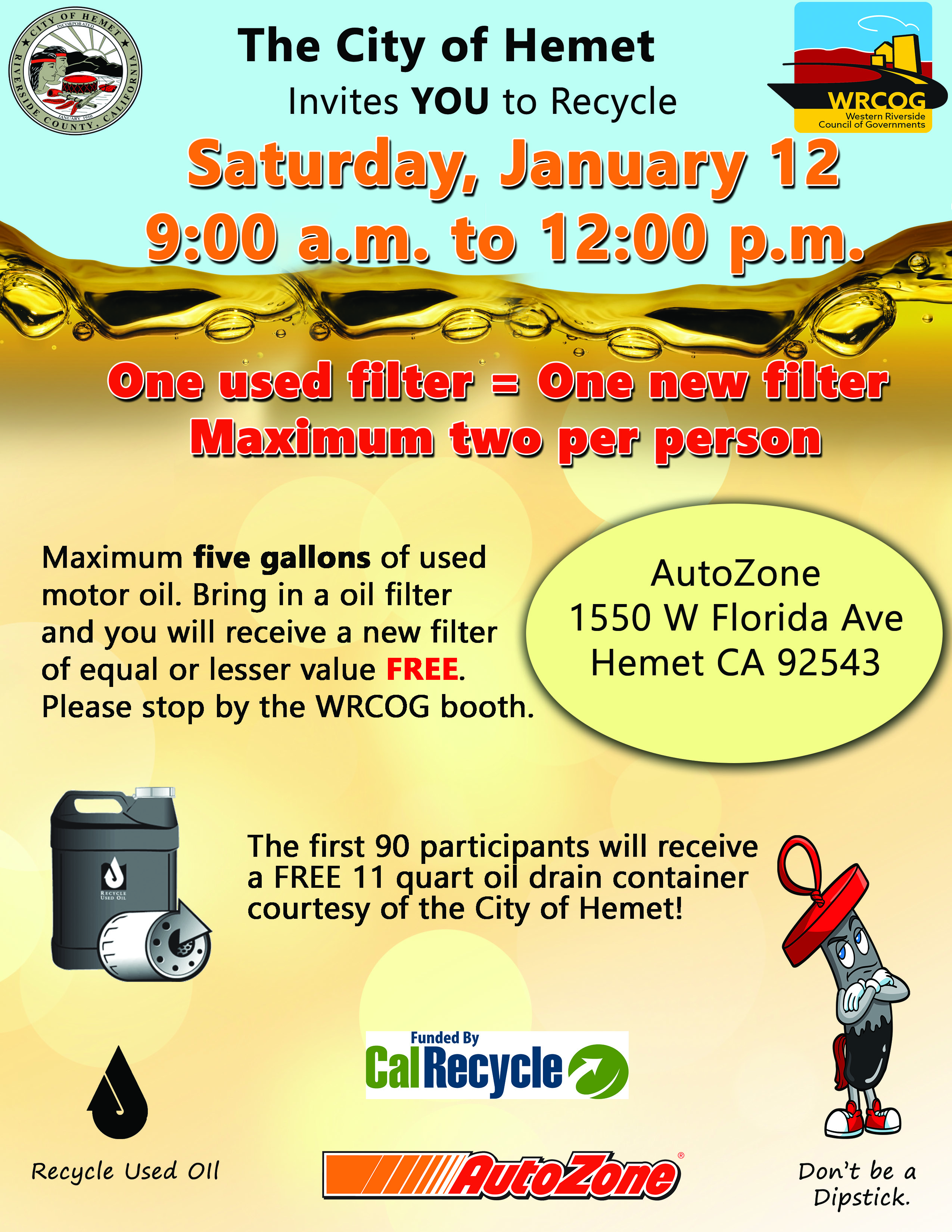 The First 90 participants will receive a FREE 11 quart oil drain container courtesy of the City of Hemet!